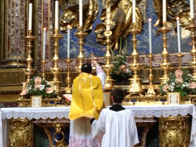 Alla sacralità del rito tridentino, potentemente ed efficacemente manifestata dall’uso del latino, lingua ieratica, si aggiungono altre caratteristiche in armoniosa simbiosi e che rendono la forma straordinaria del rito romano un’autentica esperienza mistica. Ne ricordo velocemente tre, ben note a coloro che vi hanno partecipato qualche volta o che abitualmente assistono alla Messa antica. Anzitutto, l’orientamento ad Deum, favorito dalla posizione assunta dai fedeli e dai celebranti che, spezzando il circolo un po’ autoreferenziale del guardarsi reciprocamente, volgono lo sguardo verso il Crocifisso, maestoso e semplice nel messaggio salvifico che trasmette: il Sangue di Cristo, sparso cruentamente sul Calvario, viene incruentemente effuso sull’Altare dove si rinnova il Santo Sacrificio. In secondo luogo, lo spazio dato al silenzio che avvolge discretamente l’intero svolgimento del rito, dalle apologie del sacerdote alla recitazione del Canon Missae, per dare risalto alla contemplazione e all’assimilazione intima del significato dei gesti compiuti e delle parole pronunciate. Infine, l’importanza della gestualità che, nella logica del simbolo, riassume l’antropologia cristiana, invitando i fedeli ad essere frequentemente in ginocchio per riconoscere la loro condizione creaturale di fronte al Creatore che li ama e li salva, e che nessuna dimensione della vita dell’uomo tralascia, neppure gli affetti diretti verso quell’Altare, figura eloquente di Cristo, vittima, sacerdote ed altare, che ripetutamente il sacerdote bacia delicatamente.